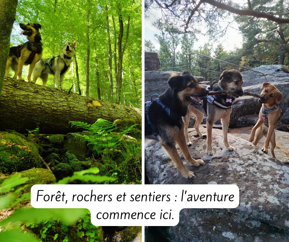 En plus faut qu’on vous disent les copains… Dès qu’on sort du gîte, on est déjà au milieu de la forêt, et ça c’est vraiment trop cool. Le sentiers au départ du gîte L’envol du coquelicot vous emmènera jusqu’au Rocher du Corbeau : un point de vue splendide pour vos humains ! Et pour vous les copains, vous pourrez jouer aux explorateurs, parce qu’il n’y a jamais grand monde là-bas.