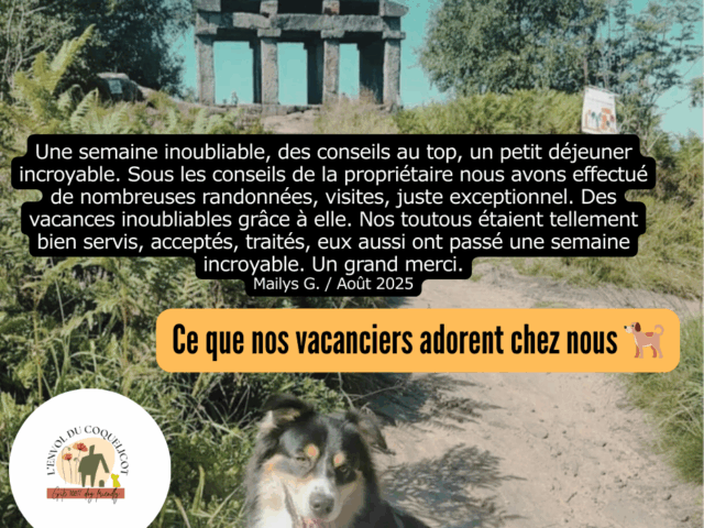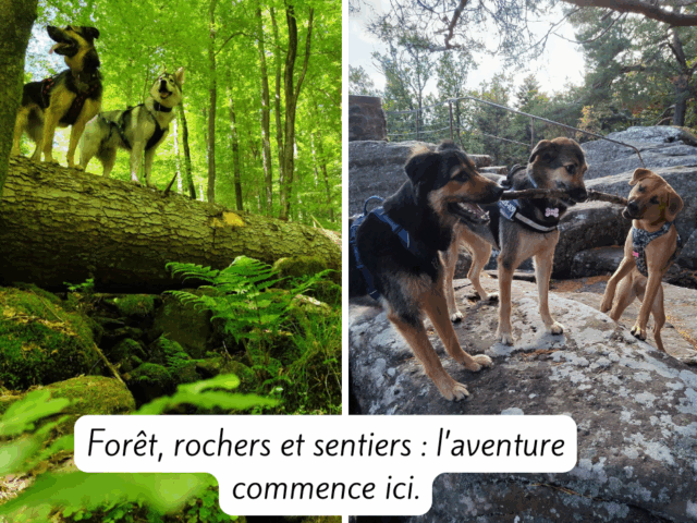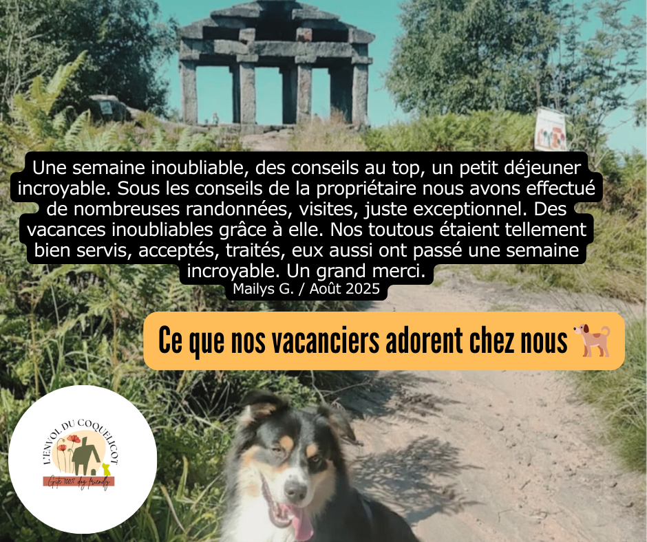 En plus faut qu’on vous disent les copains… Dès qu’on sort du gîte, on est déjà au milieu de la forêt, et ça c’est vraiment trop cool. Le sentiers au départ du gîte L’envol du coquelicot vous emmènera jusqu’au Rocher du Corbeau : un point de vue splendide pour vos humains ! Et pour vous les copains, vous pourrez jouer aux explorateurs, parce qu’il n’y a jamais grand monde là-bas.