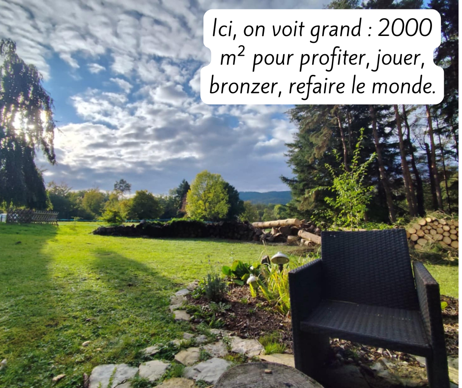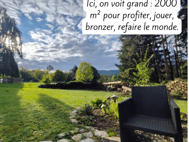 Et quoi dire de la vue : elle est époustouflante ! Vous n’aurez qu’à emprunter votre petit portillon pour accéder directement au terrain de 2000 m², qui offre largement de quoi courir et jouer à volonté… Jusqu’à la rivière qui borde la propriété : rigolades, fraîcheur et plouf assurés en toute saison.