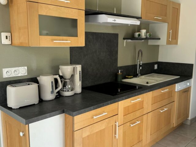- La cuisine dispose d’un lave vaisselle, un frigo, un micro onde qui fait four, une plaque à induction, une bouilloire, un grille pain et une cafetière.